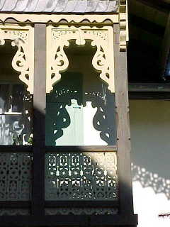 Wirkung und farbliche GestaltungDie Wirkung der Gebäude beruht ganz wesentlich auf der Ausgewogenheit der Kontraste. Das dunkle Braun der Ständer und Balken (Fachwerk) wird durch das hellere Spiel der Ornamente gelockert. Ocker - tiefbraun, beige, hellgelb - "schwedenrot" harmonieren als Erdfarben aus der Natur und verdeutlichen das Lebensgefühl des Rousseauschen Gedankens. Selten finden sich auch andere Farbkontraste.Einige Elemente wurden bei meinem Haus, das einem Malermeister gehörte, kurzerhand mit Pinsel und Schablone statt der Stichsäge angebracht. Auch hier der Kontrast ocker - braun (Treppenaufgang Remise, Balkonbrüstung, Verzierung an Fensterverkleidung). |