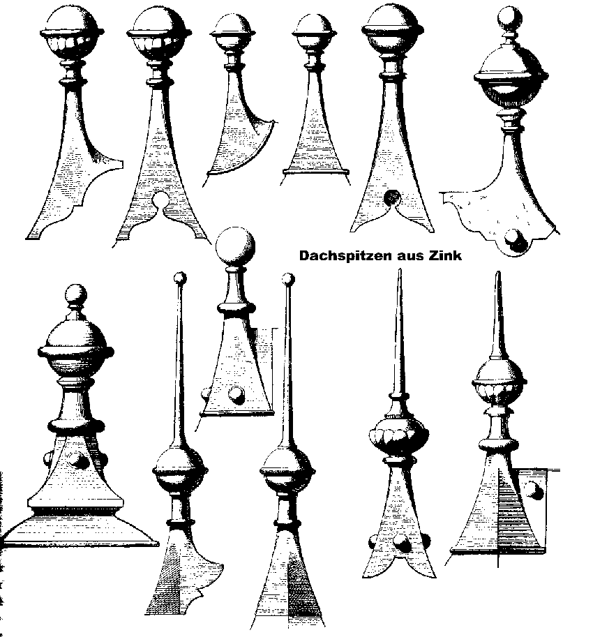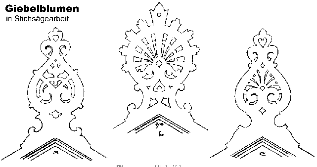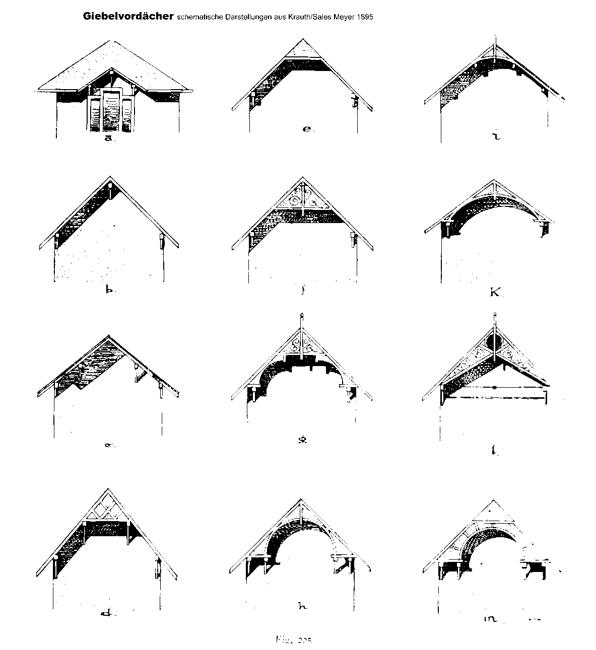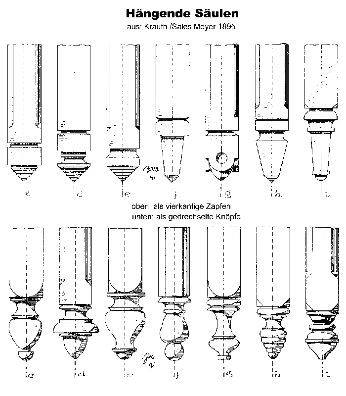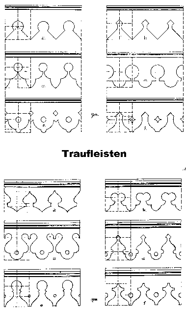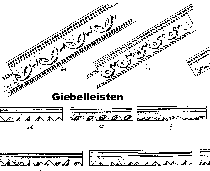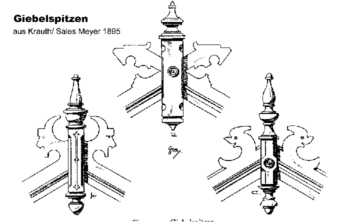 StilelementeNach meiner Erfahrung finden sich die Stilelemente auch häufig an Häusern aus rotem und gelbem Backstein und Naturstein. Als wesentliches Element sind vorspringende Dächer, Giebel und Gaupen angebracht, die reichhaltig mit Stichsägeornamenten verziert sind.Diese Ornamente bestanden meist aus phantasievollen floralen Motiven, ich habe aber auch wenige gegenständliche Ornamente in Form von Tulpen, Seejungfrauen und Löwen fotografiert. Ausgesägte Durchbrechnungen finden sich dann auch an den Latten und Füllbrettern der Balkonbrüstungen. Ornamental ausgesägte Füllungen, teilweise auch andersfarbig hinterlegt, sind ebenfalls zu finden. "Giebel und Traufleisten wurden mittels Schablonen fassoniert" (Schwarz a.a.O S. 87). Die Dachsparren sind geschwungen oder auch verziert; einfache Ausführungen erinnern mich an profane Holzklammerhälften. Weitere Verziegung und Stilelement sind die Hängenden Säulen an Giebeln, Vordächern und Balkons mit gekerbten Zapfen und/oder gedrechselten Knöpfen. Diese Hängesäulen wurden auch über den First fortgeführt und endeten in einer Krönung. Waren keine Hängesäulen zur Verzierung vorhanden wurde die Krönung in Form von ebenfalls in Stichsägearbeit ausgeführten Giebelblumen aufgesetzt. Sehr verbreitet waren auch Dachspitzen aus Zink oder Ton. Erwähnt wird bei Krauth/Sales Meyer 1895 auch die "russische Bauart die Giebelsparren über den Kreuzungspunkt hinaus verlängern und ornamental endigen (zu) lassen" An Balkons und Veranden finden sich Docken und Baluster, dies sind niedrige Pfosten und Säulchen, (stichsägearbeit)verzierte Knaggen und gekerbte Bügen stützen Balkons und die Wetterbretter über Fenstern oder Vordächern. Verzierte Stirnbretter wurden vor Balken gesetzt. Die Verkleidungsbretter an Fenstern wurden am äußeren Rand geschweift "Mit Hilfe von Abfasungen, Kehlungen, Ausschnitten und aufgenagelten Rosetten" (Krauth/Sales Meyer, 1895) wurden sich Fensterumrahmumgen gestaltet. Krauth/Sales Meyer, Das Zimmermannsbuch direkte Bestellung bei amazon |